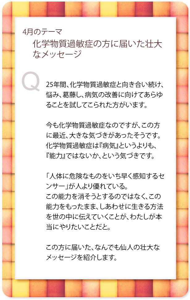 - >化学物質過敏症の方に届いた壮大なメッセージ