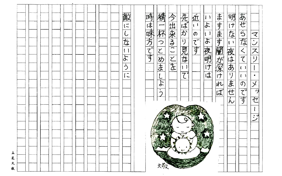 マンスリーメッセージ(2025/10) マンスリー・メッセージ(毎月1日更新) 2025.10.01 あせらなくていいのです明けない夜はありませんますます闇が深ければいよいよ夜明けは近いのです先ばかり見ないで今出来ることを精一杯つとめましょう時は味方です敵にしないように